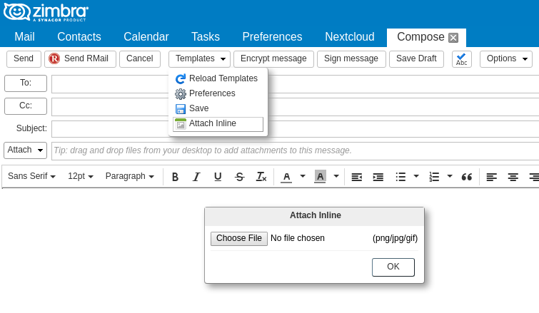 It then inserts the inline image at the cursor using data uri-images. (The regular zimbra inline images don't